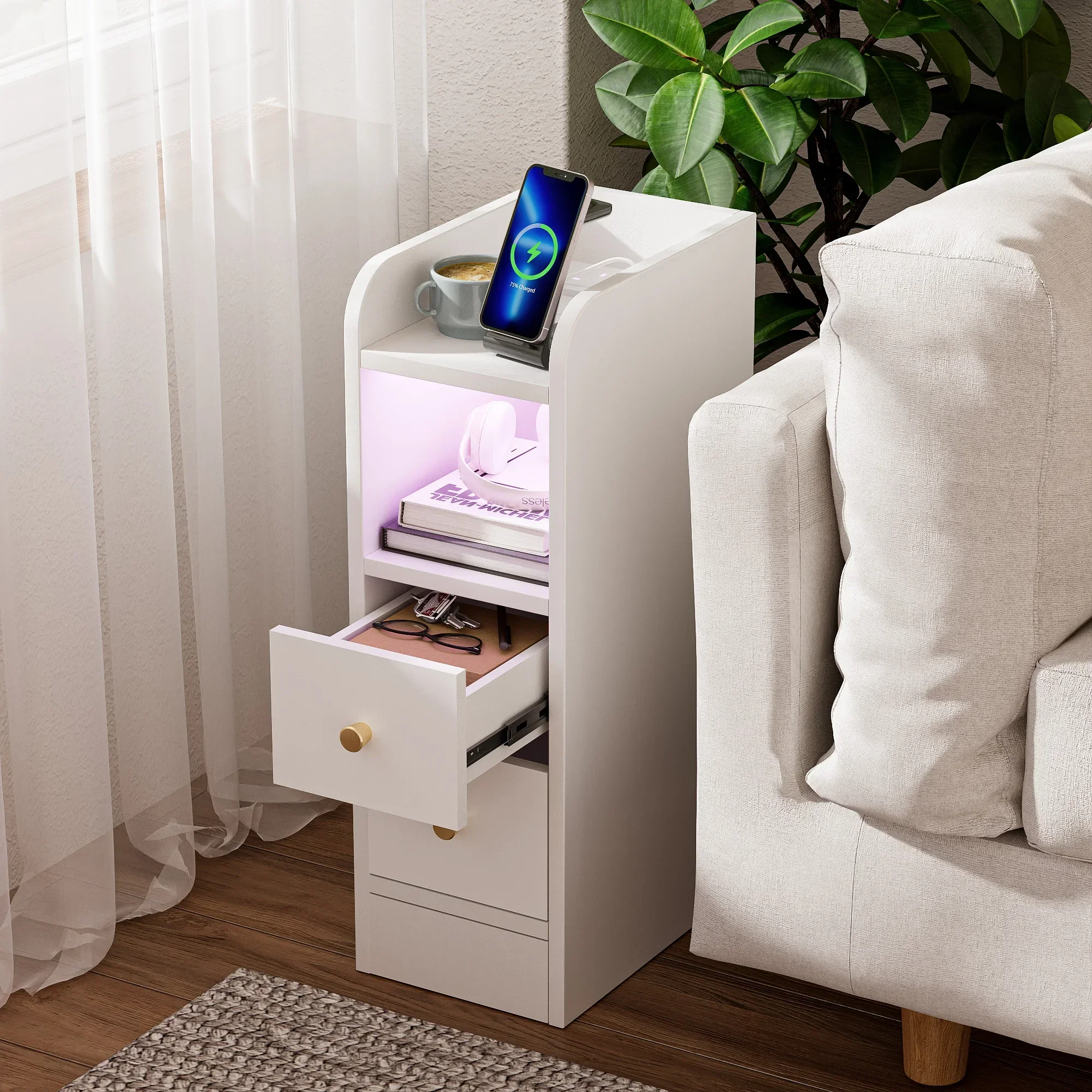Bedside Nightstand LED Lights USB Type C Charging Lockable Hidden Section Bedroom Closet Organization Modern Rolling Compartment