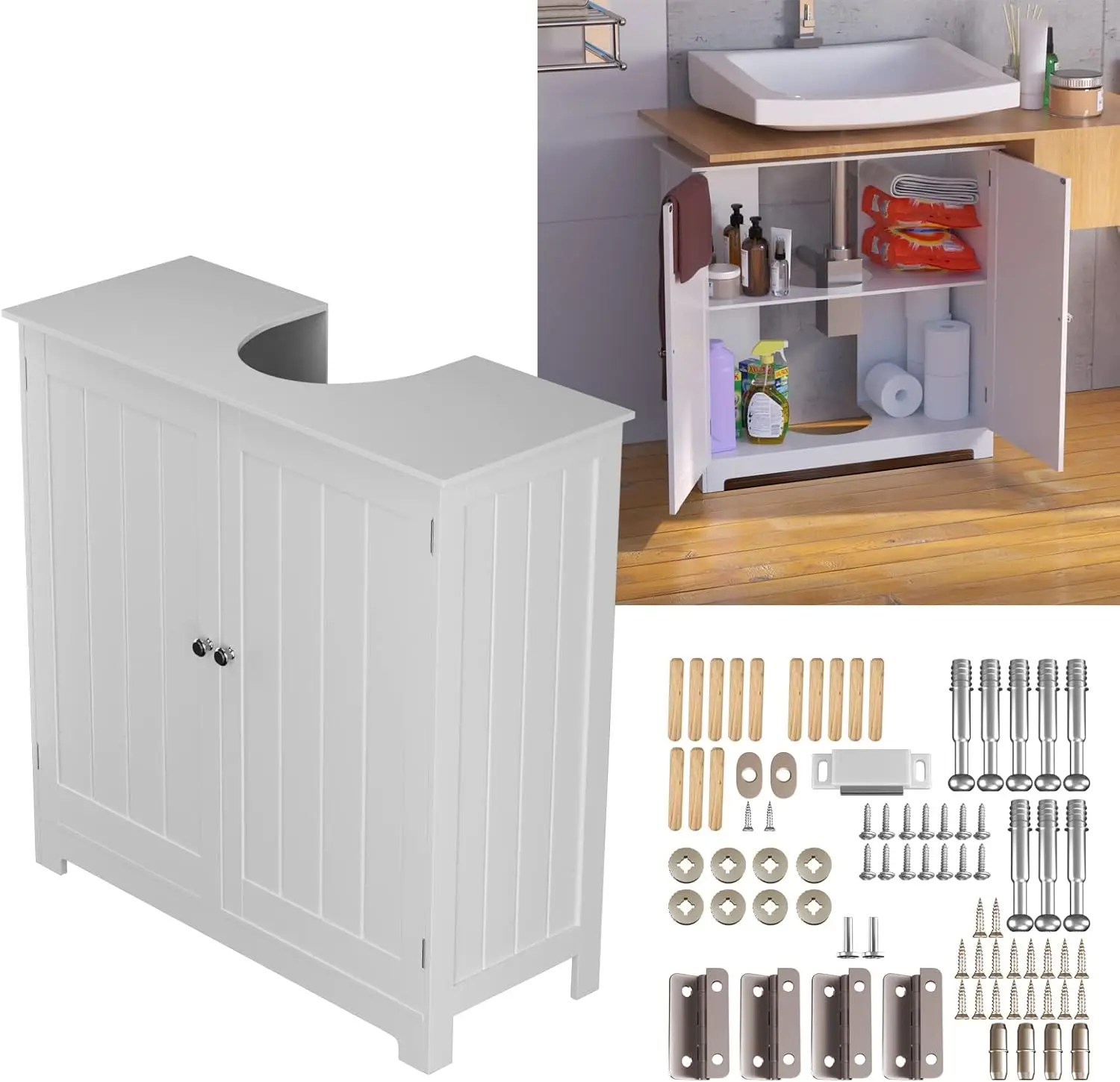 BRIEFNESS Under Sink Bathroom Cabinet, 2-Door Wooden Vanity with Adjustable Shelves, Wall Mountable & Freestanding Storage