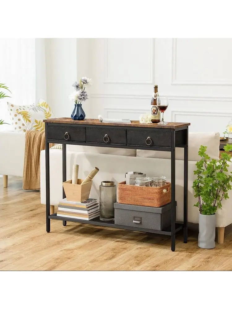 Console Table Industrial Hallway Table, Slim Sofa Table with 3 Nonwoven Drawers, Metal Mesh Frame, Sturdy, Narrow Side Table fo