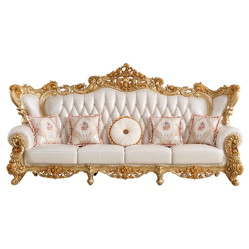 European leather sofa 1234 combination solid wood carving flower golden living room