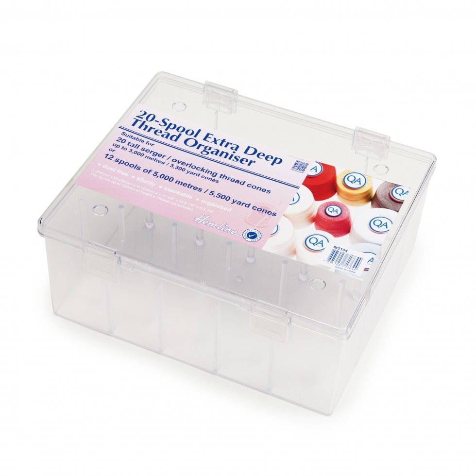 20 spool extra deep thread organiser suitable for tall serger / overlocking thread cones, up to 3,000 metres, or 12 spools of 5,000 metres. Dust free, sturdy, stackable and organised. Dimensions: 29.5 x 25 x 12.5cm.