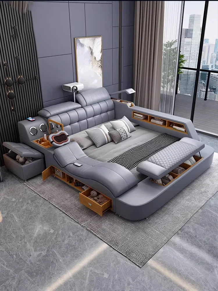 Linlamlim Luxury King Size Genuine Leather Bed / Tech Smart Bed / Multifunctional Ultimate Beds / Massage Bed with USB,Projecter