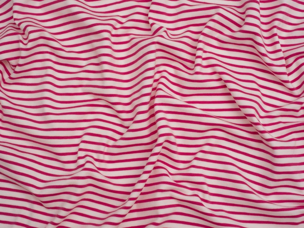 A fantastic quality stripe cotton jersey fabric from the Minerva Core Range collection. Cotton jersey is a knit fabric that is relatively easy to sew, ideal for anyone new to sewing with knit fabrics. It is made from 95% cotton and 5% elastane fibres which gives it a beautiful softness, but it still has body. The stripes in this fabric are knitted into the fabric itself, rather than printed on the surface, so you know the lines are always on grain and fantastic quality. This fabric weighs approx. 220gsm which puts it into our medium weight category here at Minerva. It is ideal for making t shirts, tops, summer skirts, dresses and shorts. It is also ideal for children and baby clothes.