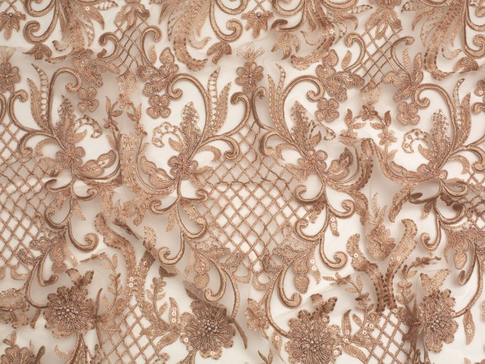 Our beautiful Zoey fabric is an exquisite lace fabric featuring lots of embroidery with beading detail and a pretty scallop down both edges. Decorated with round pearl beads, seed beads, bugle beads and sequins. Part of the Minerva couture bridal collection for the discerning bride. The beads and embellishments used on this lace fabric are of the highest quality and leave no doubt about the quality of this fabric. It is the perfect special fabric to make your own wedding dress, but can also be used for formal and special occasion wear such as prom dresses, bridesmaid dresses and mother of the bride.