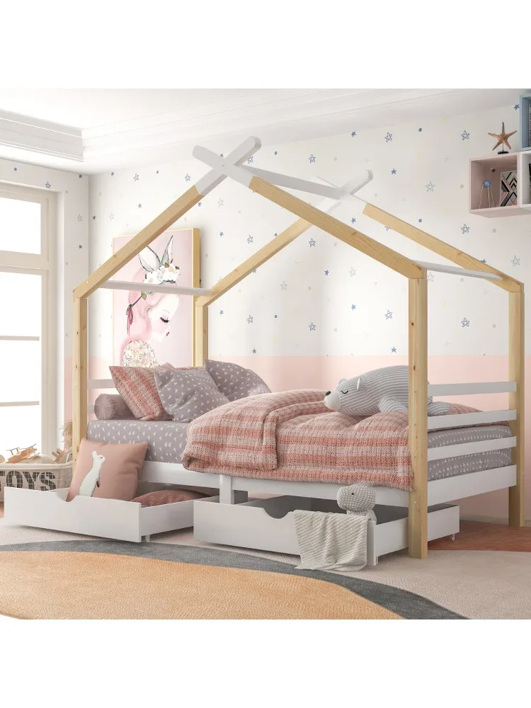 PINGGO Kids Single Bed Frames Toddler Beds Storage Underneath 3FT Single Bed with Storage Solid Pine Wood House Tree Canopy Bed