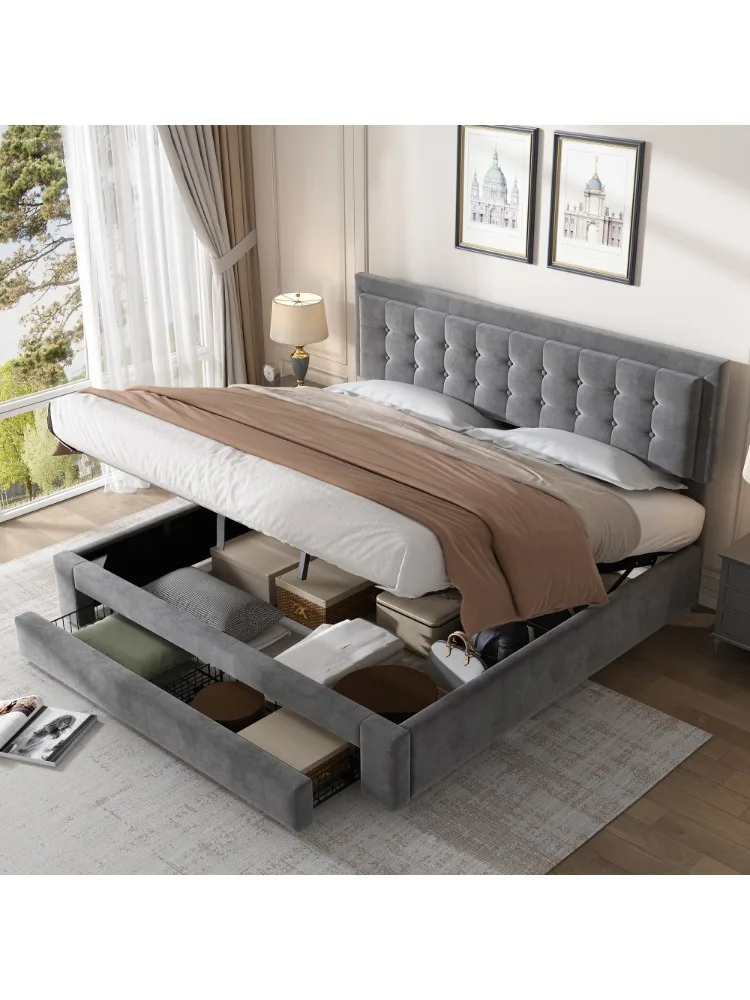 PINGGO Upholstered bed,King-5ft(150*200cm), velvet fabric, double bed, large storage space,Without Mattress,Grey