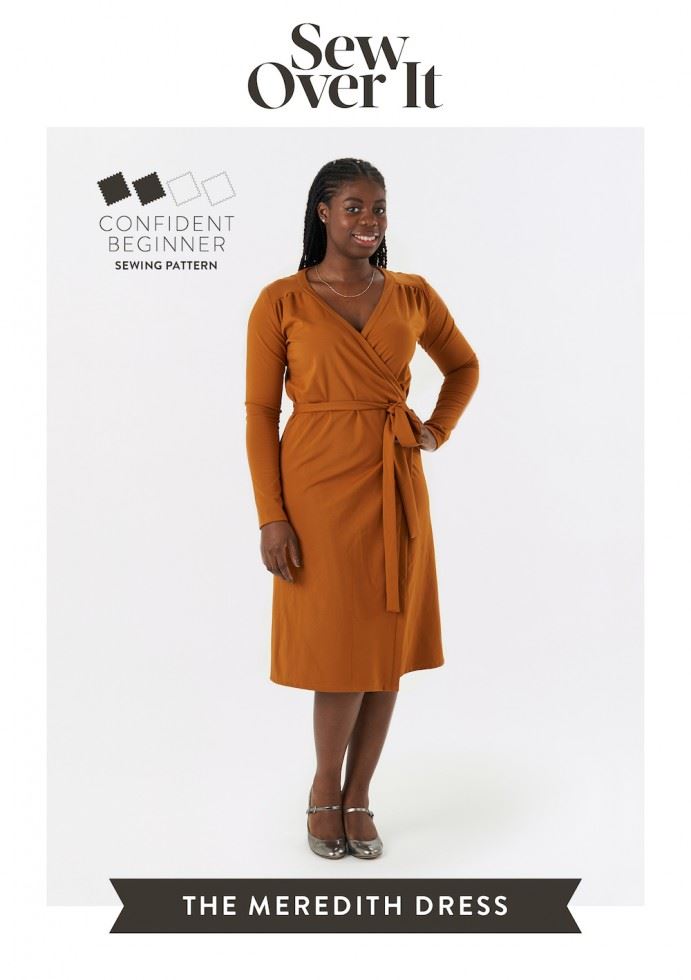 The Meredith Dress is a versatile wrap dress, designed to be sewn in jersey. Simple yet elegant, Meredith features a wrap front with modest V neckline, as well as a neckband which helps avoid any dreaded gaping! The gathers at the shoulder yoke provide shaping and help to achieve a great fit around the bust, and the tie keeps the dress closed whilst cinching you in at the waist. Merediths very slightly A line skirt has two hem length options (below the knee and on the knee), and the sleeve can be cut full length or three quarters to suit your preference. Sumptuously comfy yet elegant and stylish, Meredith is a great work staple. She looks classic in a polka dot or solid, but can equally rock a print. With her minimal seams, shes the perfect canvas for a bright, bold larger scale floral, geometric or abstract pattern!
