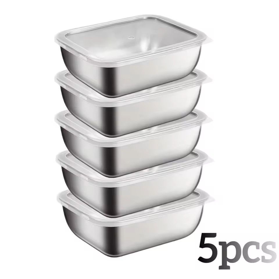 Product Description: Keep your food fresh, organized, and easy to access with these Stainless Steel Food Storage Containers. Featuring durable flip top lids, these reusable containers are perfect for the fridge, kitchen shelves, meal prep, picnics, and on the go storage. Lightweight yet sturdy, they offer a clean, modern way to store snacks, leftovers, dry goods, fruits, and moreall while reducing plastic waste.Product Specifications: Material: Premium stainless steel Quantity Options: 5 pieces or 10 pieces Lid Type: Flip top, easy open and close Use: Food storage, fridge organization, kitchen pantry, picnics, lunch boxes Features: Reusable, stackable, durable, odor resistant Cleaning: Easy to wash and maintain Portability: Lightweight and ideal for travel Key Features: Durable Stainless Steel: Rust resistant, long lasting, and safe for food storage. Flip Top Lids: Easy access design while keeping food fresh and protected. Reusable and Eco Friendly: Reduce plastic waste with long lasting storage containers. Multi Purpose Use: Suitable for fridge storage, meal prep, snacks, dry items, and more. Stackable Design: Saves space and keeps your kitchen or fridge organized. Travel Friendly: Perfect for outdoor picnics, camping, office lunches, and school snacks. Easy to Clean: Smooth surface washes quickly and stays odor free.Additional Details: Great for keeping ingredients organized and visible. Suitable for kids and adults thanks to lightweight design. Ideal housewarming, kitchen upgrade, or practical gift. Works well for both hot and cold lunches.