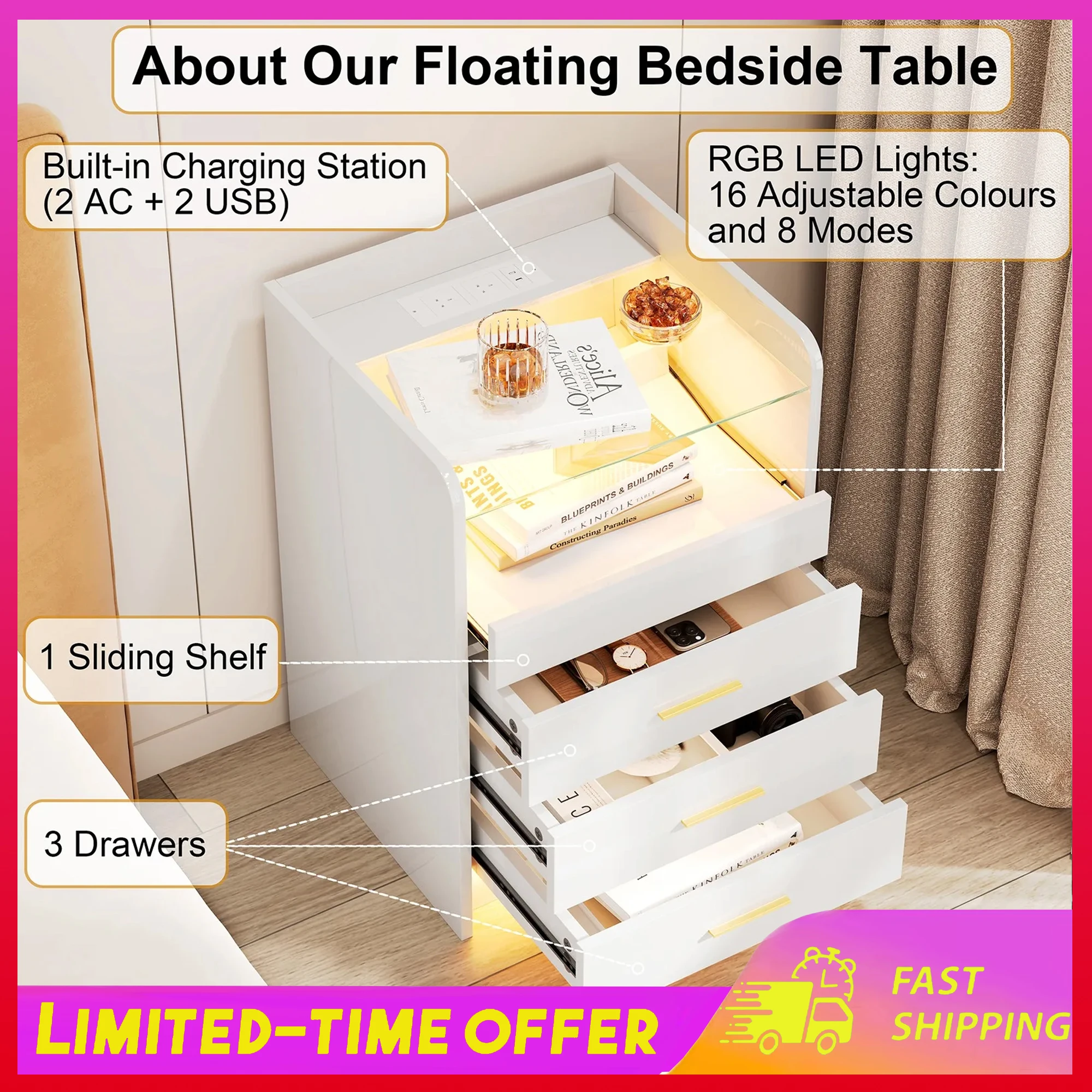 Wooden Bedside Table Charging Station Nightstands Light Strip for Sofa Side Bedroom Living Room UK Plug Home Furniture